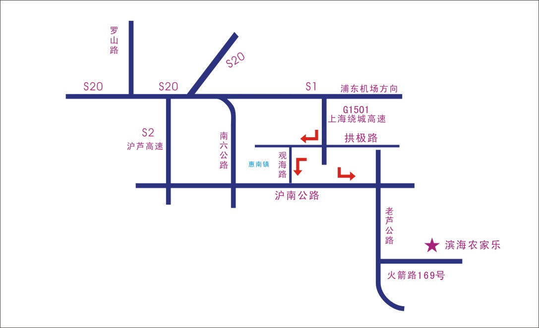 自驾车路线: 《路线》市区方向出发→到S20外环线往S1浦东机场方向→G1501(郊环高速)东海大桥方向→到拱极路出口出来往惠南镇方向→到观海路左转→到沪南公路左转→往东一直开到老芦公路右转→过第四座桥后马上左边就是火箭路,并且有滨海农家乐的指示牌→跟着指示牌的方向前行800米即到农家乐(火箭路169号)。 乘车路线: 地铁2号线到浦东龙阳路站下,2号出口乘龙芦线到老港镇东河村招呼站下车,再电话联系可来接你们。
